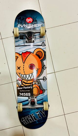 Skate de la marca Punisher con un diseño llamativo. Ideal para regalar para Reyes! - Diseño gráfico de oso Bear Factory. - Gráficos Guilty en la parte inferior. - Ruedas de color crema Punisher - Ejes Punisher