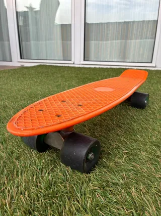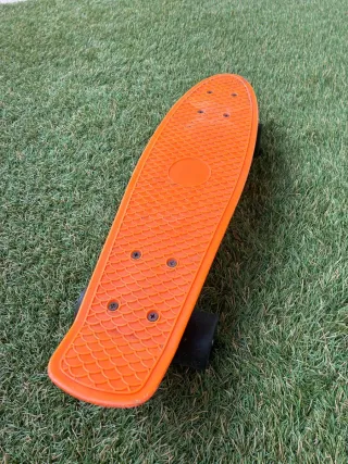 Monopatín de color naranja brillante, perfecto para desplazamientos urbanos o para iniciarse en el skate. - Cubierta con textura antideslizante. - Ruedas negras. - Diseño compacto y ligero.