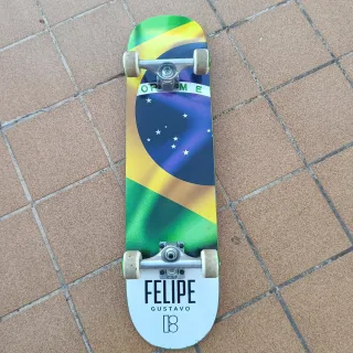 Skate completo con diseño inspirado en la bandera de Brasil y el nombre de Felipe Gustavo. - Diseño de la bandera de Brasil. - Nombre Felipe Gustavo en la parte inferior. Muy poco uso, apenas unas horas.