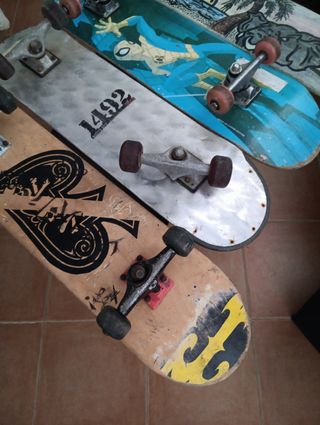 Se venden cuatro tablas de skate usadas. Lo han dado todo y muestran señales de uso. - Tres tablas tienen diseños diferentes. - Una tabla es de color plateado. - Ideales para principiantes o para coleccionistas.