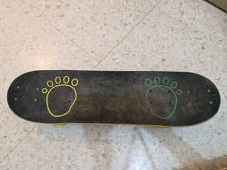 Patín negro con diseño de huellas en azul y rojo. - Diseño de huellas en la parte superior. - Ruedas amarillas. - Nunca usado *Oferta: este patinete y el otro skate en mi cuenta son 25€