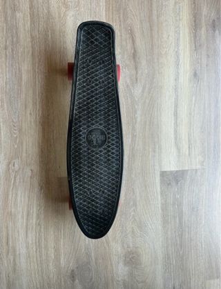 Skate estilo penny board de color rojo. - Tabla de plástico resistente. - Ruedas negras. - Ejes metálicos.