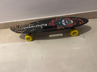 Mini skate con un diseño llamativo y original. - Tabla con estampado de calavera, rosas y balas. - Ruedas amarillas. - Texto Bullet speed en la tabla. -Medidas:60x18cm