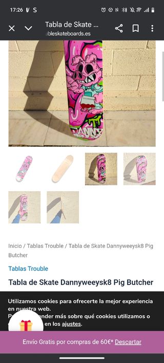 PRECIO NEGOCIABLE Costaba 69€, usada 2 días Tabla de skate de la marca Trouble con un diseño llamativo de Dannyweeysk8 Pig Butcher. Prácticamente nueva, lista para usar. - Diseño gráfico exclusivo. - Marca: Trouble. - Modelo: Dannyweeysk8 Pig Butcher.