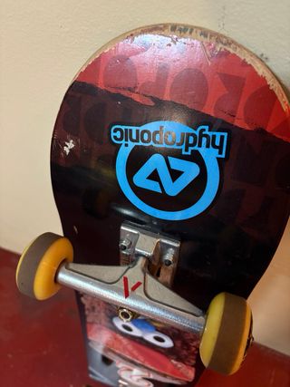 Tabla de skate de la marca Hydroponic con un diseño llamativo. - Tabla sin golpes (pequeños arañazos en los bordes) - Ruedas con poco desgaste - Ejes Venture - Rodamientos Abec
