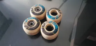 Ruedas bones, ejes silver, rodamientos reds, tabla rave y lija bastante aderente. Use la tanla 6 veces a lo mucho