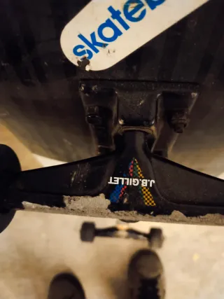 Tabla, ejes, rodamientos y ruedas JART. Tiene puestos unos tornillos de cabeza redonda porque se desmontó la tabla en su momento y al volver a montarla solo tenía esos por casa. No me han causado molestia ni dificultad para grindar ni desplazarme, en cualquier caso, solo habría que cambiarlos. Apenas tiene marcas de uso en la parte baja de la tabla. Precio negociable.