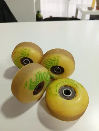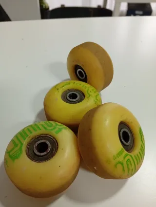 Set de cuatro ruedas de skate en color amarillo. Listas para montar. - Diámetro de 54 mm. - Dureza 99A. - Incluyen rodamientos. Todavía tienen mucha vida!!