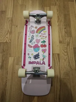 Skate Cruiser Impala, modelo "Latis" en colaboración con la artista Art Baby Girl. Diseño Old School de 31.5". Está en perfecto estado (ver fotos de la tabla, ruedas sin desgaste). Componentes originales: Ejes TENSOR y rodamientos ABEC-7, raíles protectores en la base. Ideal tanto para pasear como para colección por su diseño exclusivo. Regalo perfecto.