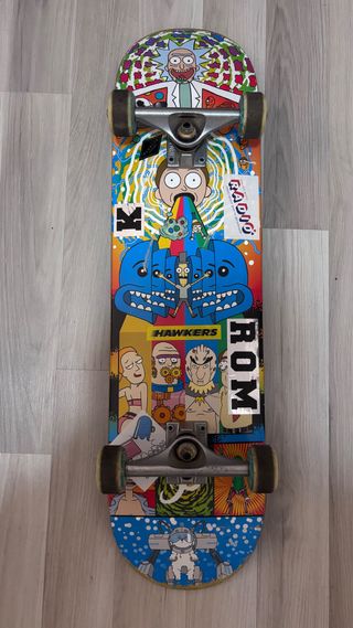 Skate con un diseño llamativo y vibrante. Tiene los rodamientos nuevos, lija nueva por si la quieren cambiar, llantas seminuevas , diseño gráfico con calavera y mariposa, tiene elevadores en los trucks y rieles, el precio es negociable