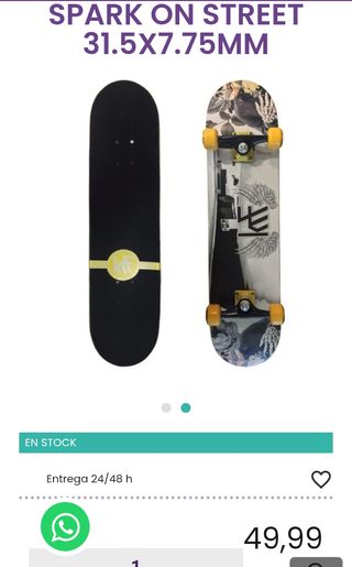 Skateboard KRF Spark On‑Street, en muy buen estado, prácticamente sin uso. Su tabla está fabricada en madera de arce ruso con 7 capas doble kick, con unas medidas de 31,5 × 7,75 pulgadas, lo que equivale aproximadamente a 80,0 × 19,7 cm. La parte inferior lleva un diseño Heat Transfer y la superior tiene lija antideslizante 80AB. Va montado con ejes de aluminio de 5″, ruedas PU Casting de 50 × 36 mm (HR99A), cushion de PU HR92A, rodamientos ABEC‑5 Carbon y riser de 4 mm en PE. Soporta hasta 100 kg. Ideal para skaters de nivel intermedio que buscan un skate urbano con buen rendimiento y diseño atractivo.