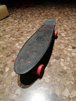 Patinete tipo pennyboard negro, con ejes blancos y ruedas rojas, rodamientos y ruedas en perfecto estado.