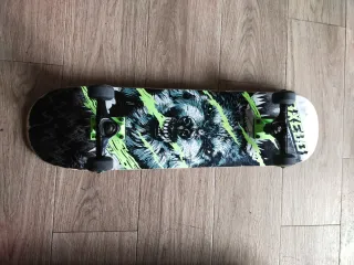 Skate Oxelo con un diseño llamativo de calavera y elementos gráficos en verde y negro. - Tabla con diseño de ladrillos y calavera motera. - Ruedas de color verde brillante. - Ejes negros. - Estado tiene muy poco uso pero se ha de limpiar