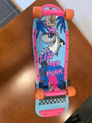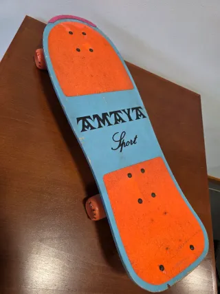 Skate AMAYA SPORT. Este es un monopatín vintage de los años 80, fabricado por la marca española Amaya Sport. Es un artículo muy característico de la época por su estética "neón", la tabla de madera ancha (old school) y los accesorios de plástico (railes laterales, tail guard y nose guard). Tiene un gran valor como marca icónica Española. con diseño llamativo en azul y naranja. Perfecto para disfrutar al aire libre. Es - Tabla con lija naranja. - Ruedas naranjas. - Logo AMAYA SPORT. "Skate Vintage años 80", "Amaya Sport Land Shark", "Old School Skateboarding" y "EGB".