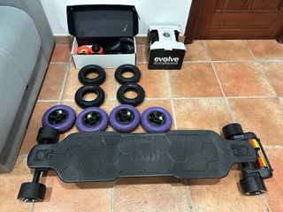 Evolve GTR Carbon – Pack Premium (Solo 2 usos) Se vende skate eléctrico de fibra de carbono en estado de reestreno (sin arañazos). Un equipo de alta gama con máxima personalización y todos los extras oficiales. • Ruedas de Calle: Dos juegos (negras y naranjas). Diferentes tamaños para priorizar aceleración o velocidad punta. • Kit Todoterreno: Neumáticos negros y morados. Incluye engranaje reductor para no perder velocidad en montaña. • Extras: Luces oficiales instaladas, 2 cascos impecables (uno nuevo), mando a distancia, cargador y herramientas con su maletín original. No se pone precio se escuchan ofertas serias, Gracias