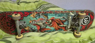 Tabla de skate completa de la marca Darkstar con un diseño llamativo. Lo compré hace unos años por 110 euros. No tiene mucho uso ya que a los dos meses de comprarla dejé de practicar skate. Lo único que le puede faltar sería engrasar los ejes por su falta de uso a lo largo de los años. Preferencia a la venta en persona. - Diseño gráfico detallado. - Ruedas y ejes incluidos.