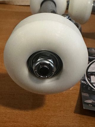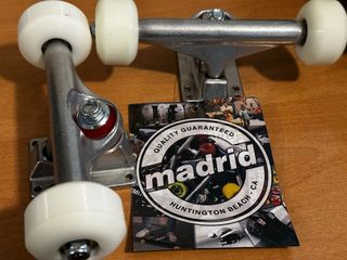 Ejes y ruedas duras de 53mm con sus rodamientos para montar skate de 8,25” completamente nuevos. Venian montados en una tabla de la marca Madrid. A recoger en embajadores. No envio