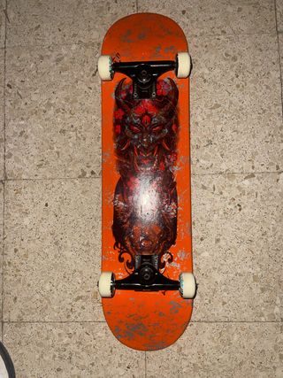 Skate completo con diseño gráfico. Skate Completo, La tabla y los ejes son nuevos y tienen muy poco uso, ya que dejé de patinar al poco de comprarlos. PARTES: -Tabla 8'0 Marca DARKSTAR x Gred Lutzka. -Ejes Independent Colaboración con SLAYER con Kingpin Hollow. - Rodamientos BONES Red. - Ruedas Globe duras. Piezas por separado: cuestan +140€ - Tabla con ilustración de guerrero. - Ruedas amarillas. - Ejes metálicos.