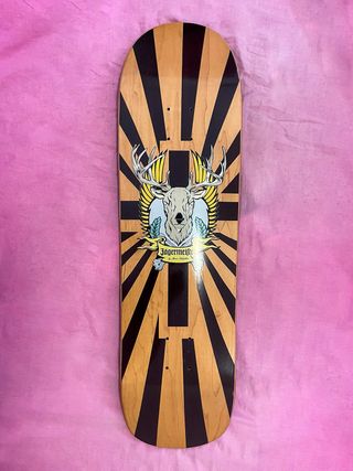 Skate muy bien conservado con algunos raspones en la parte inferior , tiene unos ejes de buena calidad y los rodamientos y accesorios son muy buenos es muy bonita la estética esta valorado en 165 euros . precio negociable