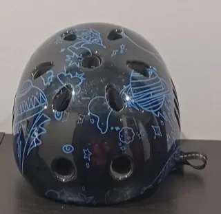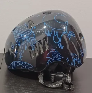 Casco para patinar con un divertido diseño espacial. TALLA 50- 54 cm(S) - Color negro con dibujos azules. - Estilo unisex.