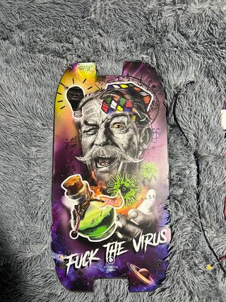 Tabla de skate con un diseño artístico y llamativo. - Ilustración Fuck The Virus con elementos de ciencia y espacio. - Imagen central de un científico con un cubo de Rubik. - Detalle de un matraz con líquido verde y virus. - Motivos cósmicos y fórmulas matemáticas.
