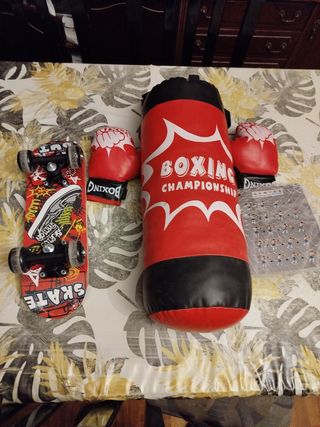 Skate y saco de boxeo con 2 guantes todo prácticamente sin uso es para niños