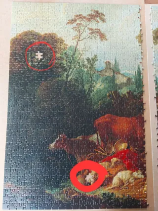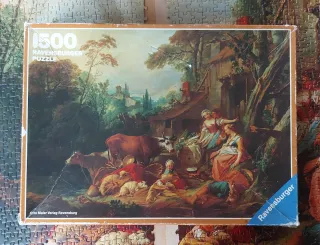 Puzzle de la marca Ravensburger con 1500 piezas. La imagen muestra una escena campestre con figuras humanas, animales y una edificación. Puzzle limpio y libre de humo. Faltan 2 piezas