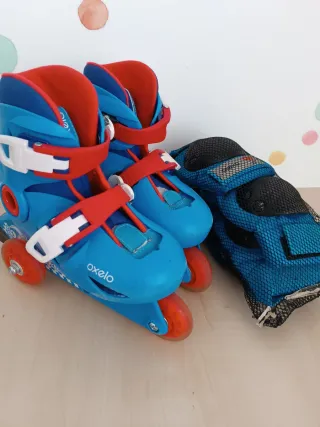 Patines en línea Oxelo para niños, con un diseño llamativo en azul y rojo. - Cierre de velcro y hebilla para un ajuste seguro. - Ruedas de color naranja. - Marca Oxelo visible en la lengüeta y lateral.