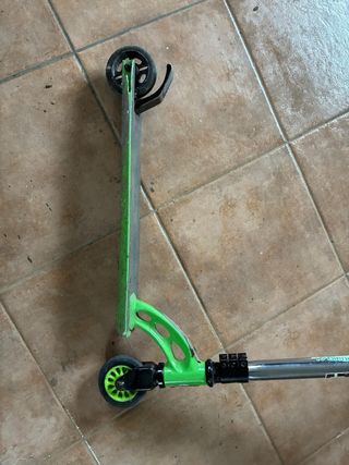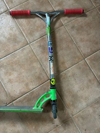 Patinete MGP Custom con manillar plateado y puños rojos. La base y la horquilla delantera son de color verde brillante. - Manillar con puños rojos. - Base y horquilla delantera en color verde. - Diseño personalizado con pegatinas. - Manillar PRO de acero