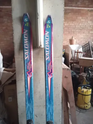 Se venden esquís Salomon F8. - Diseño en azul con detalles en rosa y morado. - Logo de Salomon en la parte superior.