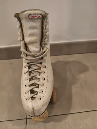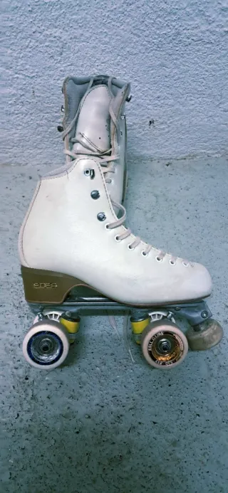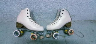 Patines blancos de patinaje artístico. - Diseño clásico. - Cordones blancos. - Ruedas de patinaje.