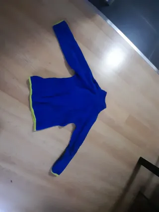 Camisetas térmica de manga larga, ideal para esquiar o actividades al aire libre. 8 euros unidad - Color azul vibrante. - Ribete de color verde lima en cuello, puños y bajo. - Cremallera corta en el cuello. - Dos bolsillos con cremallera en el frontal.
