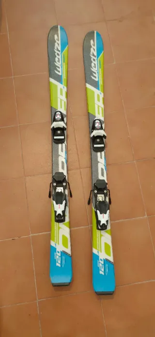 Esquís infantiles de la marca Wedze, perfectos para iniciarse en el esquí. - Longitud de 120 cm. - Fijaciones incluidas. - Bastones de 100 cm - En 2 días de esquí están amortizados - Bastones incluidos
