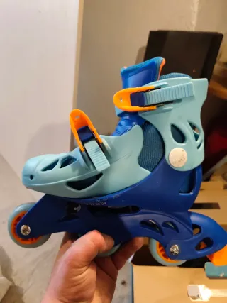Patines en línea de 3 ruedas de la marca Juguettos. Son ajustables para adaptarse al crecimiento. - Diseño en color azul y naranja. - Cierre de seguridad. - Tallas ajustables. - Sistema 2 en 1.
