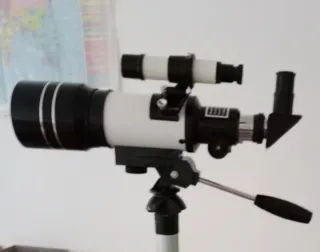 Pequeño telescopio, cómodo y practico, Incluye tres potentes oculares que compensan su corta distancia focal proporcionando una imagen nítida y clara gracias al objetivo acrómático de 70mm. con el que se pueden observar infinidad de cráteres y detalles de la Luna, los satélites de Júpiter girando alrededor de su esfera planetaria, Saturno y sus anillos, etc. Probado y revisado. El trípode está reparado, pero funciona bien. - Montura altazimutal de fácil manejo - Buscador y diagonal de espejo. - Trípode ajustable. - Mapa explicativo de la Luna