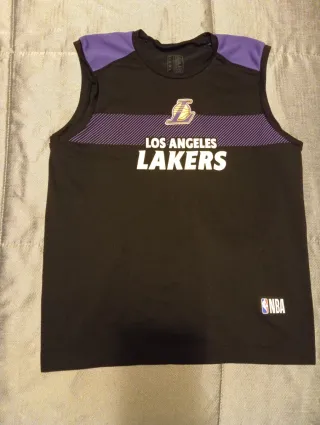 Camiseta sin mangas del equipo de baloncesto Los Angeles Lakers. Marca Tarmak (Decathlon). - Diseño oficial de la NBA. - Colores negro y morado. - Logo de los Lakers en el pecho. Talla 12-13 años ajustada (da poca talla)...aconsejo para menor edad. Medidas: 50 cm de alto, 38 cm de ancho.
