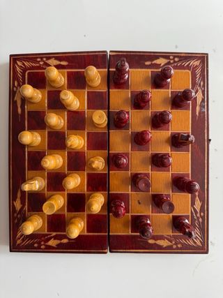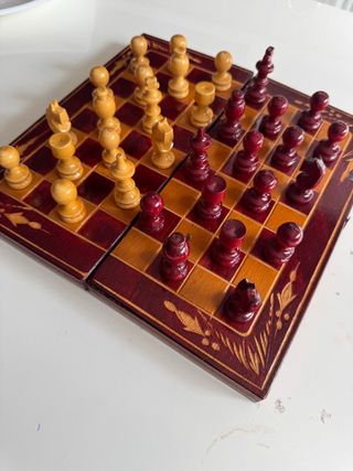 Tablero de ajedrez de madera con piezas incluidas. Ideal para partidas. - Diseño clásico. - Piezas de madera. - Tablero plegable.