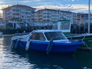 Embarcación de fibra de 6,5 metros, tipo cabinada. Es de color verde oscuro y blanco. - Marca: Ardora - Eslora: 6,5 metros - Tipo: Cabinada - Material: Fibra
