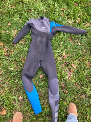 Traje de surf de neopreno de la marca Billabong. - Color principal gris oscuro y negro. - Mangas y parte inferior de las piernas en azul vibrante. - Paneles reforzados en rodillas. - Logo de la marca visible en el pecho y en la pierna.