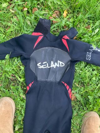 Traje de surf Seland de manga corta y pernera larga, ideal para deportes acuáticos. Presenta un diseño en negro con detalles en rojo y el logo de la marca en el pecho. - Color: Negro con detalles rojos. - Marca: Seland. - Diseño: Manga corta y pernera larga.