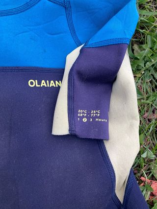 Traje de surf de manga corta y pernera corta para niño, ideal para proteger del sol y el frío en el agua. - Color azul y verde lima. - Marca OLAIAN. - Cierre de cremallera en la espalda.