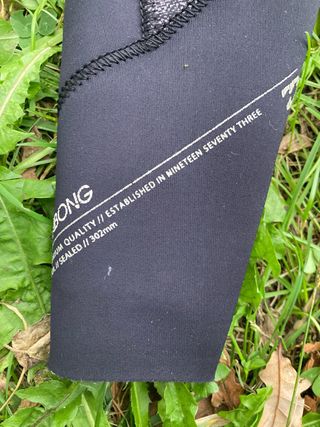 Traje de surf de manga larga, ideal para deportes acuáticos. - Color principal negro con detalles en azul. - Cuello alto para mayor protección. - Paneles reforzados en rodillas.