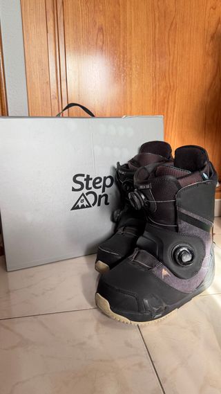 Botas y fijaciones Burton Step On para snowboard. Aceptaría 350€ para venta en persona. Modelo Swath doble boa. Están en buen estado, tanto fijaciones como botas. Talla 41, 26cm, 8us - Botas Burton talla [insertar talla]. - Fijaciones Burton Step On. - Sistema de cierre Boa.