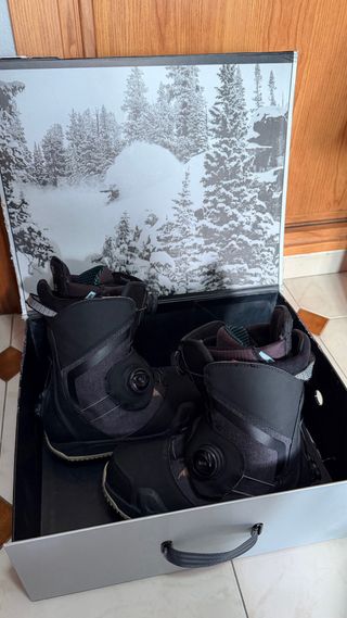 Botas de snowboard Burton Photon 40 (250mm), con fijaciones Step-On talla S. Lo más cómodo del mercado. - Sistema de cierre Boa. - Diseño en color negro. - Incluye fijaciones Burton Step-On. En muy buen estado, tendrán 30 días de uso, con su caja e invento. Incluyo otros 2 discos de anclaje. Me han regalado equipamiento específico para carving y esto se me queda un poco sin uso. Solo en mano para que puedas probarlo. No voy a rebajarlo, por menos prefiero quedármelo por si algún día prefiero ir más de paseo, pero da pena tenerlo sin darle uso.