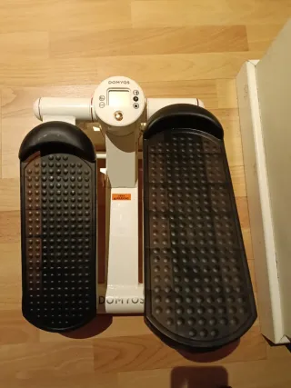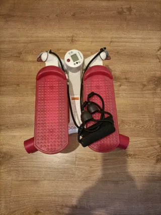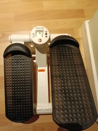 Vendo step Domyos 500 de Decathlon, ideal para hacer ejercicio en casa. Está en buen estado, aunque la caja presenta algunos desperfectos. - Monitor digital que muestra el tiempo, las calorías quemadas y las pulsaciones. - Resistencia regulable. - Incluye dos bandas elásticas para ejercicios adicionales. - Sistema de plegado para facilitar su almacenamiento.