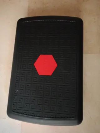 Plataforma de step o cajón de gym en color negro con detalles en rojo. - Superficie texturizada para mayor agarre. - Diseño hexagonal central en rojo.
