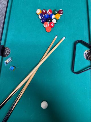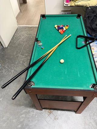 Mesa de billar compacta, ideal para entretenimiento en casa. Incluye accesorios para empezar a jugar. - Superficie de juego verde. - Patas de madera. - Incluye taco de billar, bolas y triángulo. - juego hokey y posibilidad de pinpon.