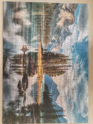 Puzzle de 1000 piezas con una hermosa imagen de un paisaje de montaña y lago reflejado. - Imagen detallada de montañas, árboles y cielo. - Ideal para amantes de los puzzles y la naturaleza.
