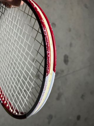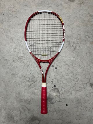 Raqueta de tenis Artengo modelo 700. - Marco de color rojo y blanco. - Cuerdas blancas. - Empuñadura roja.