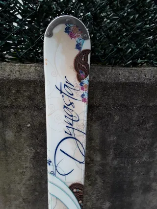Esquís Dynastar Exclusive Sensation para mujer. Diseñados para ofrecer un buen rendimiento en pista. - Esquís de mujer. - Modelo Dynastar Exclusive Sensation. - Diseño con detalles florales y el logo de la marca.